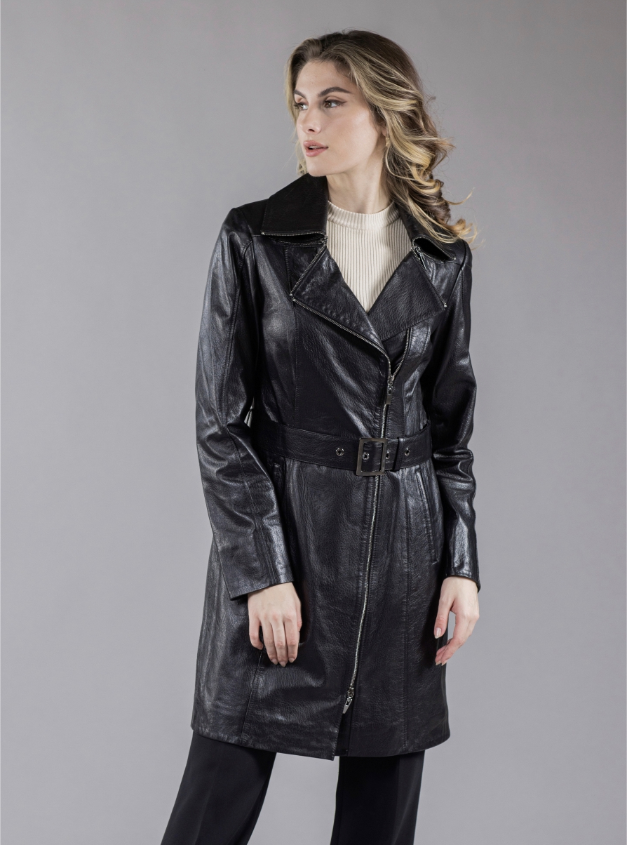 Кожаное полупальто с косой линией застежки – новинка весенней коллекции сезона 2023 от «Тверской меховой». Куртка «Клер» объединила в себе все любимые покупательницами элементы кожаной «косухи» с удобной длиной 90 см для прохладного городского межсезонья. Косая застежка-молния позволяет легко менять форму воротника – от аккуратного отложного в полностью застегнутом виде до широкого английского, который можно дополнить ярким шейным платком. Прорезные карманы удобны и функциональны. Широкий пояс с металлической пряжкой помогает создать строгий подтянутый силуэт. Длина полупальто позволяет комбинировать его с классическими брюками, строгой юбкой или деловым платьем. Черный цвет куртки «Клер» – отличная база для экспериментов с яркими аксессуарами. Двигайтесь навстречу новому сезону в ритме большого города в куртке «Клер»!Характеристики