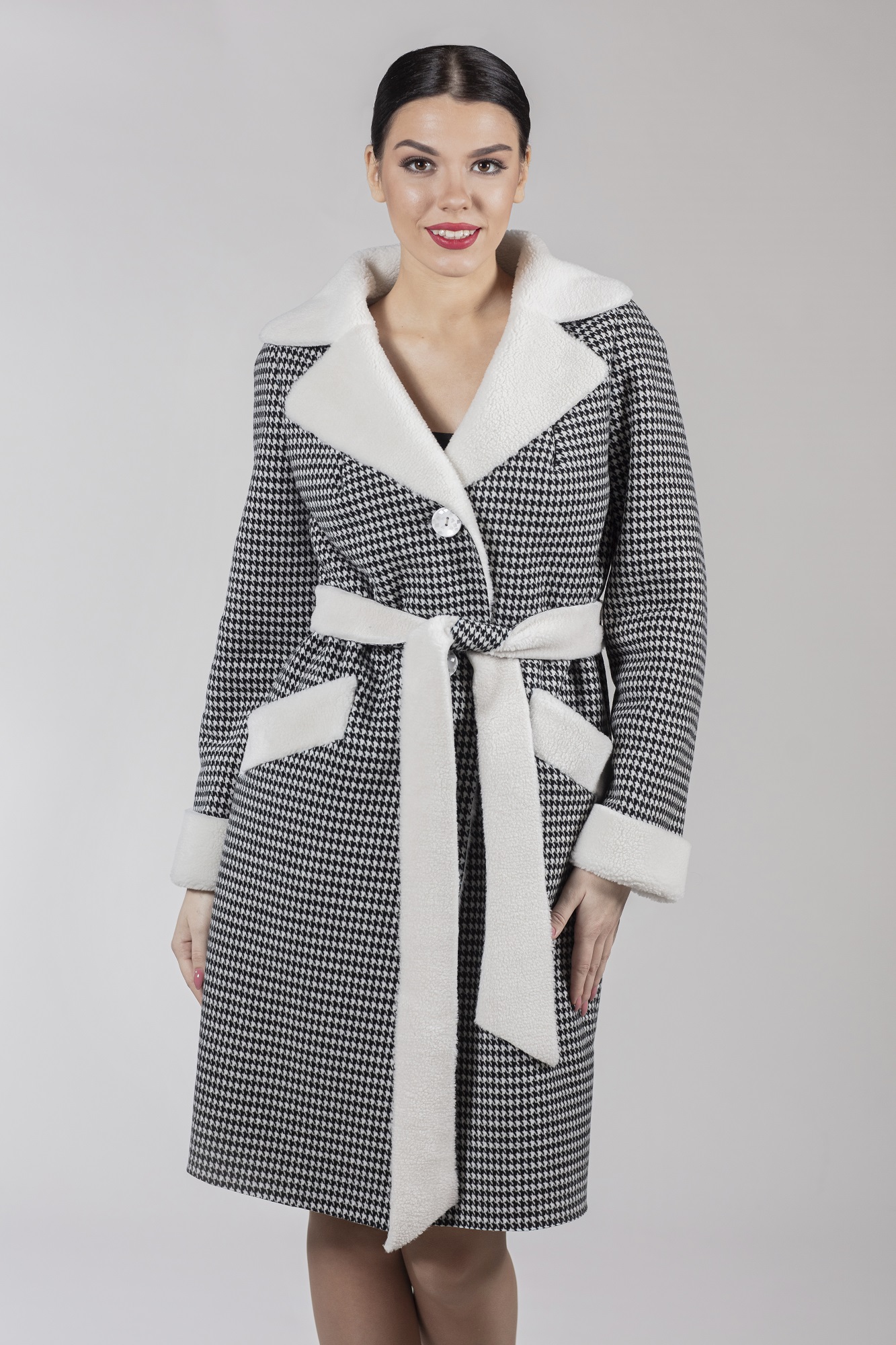 Ультрамодная новинка «Абби» - полупальто из шерсти и полиэстера с большим английским воротником. Стильный черно-белый рисунок приковывает взгляды окружающих. Новинка весьма вариативна: Вы можете носить её как с поясом в сочетании с лёгким шарфом, так и свободной, без пояса с запахнутым воротником. Карманы в изделии с меховой оторочкой - это прекрасно сочетается с мехом на поясе и воротнике. Длина полупальто – ниже колена, а это означает комфорт и тепло мягкой зимой и в межсезонье.Характеристики