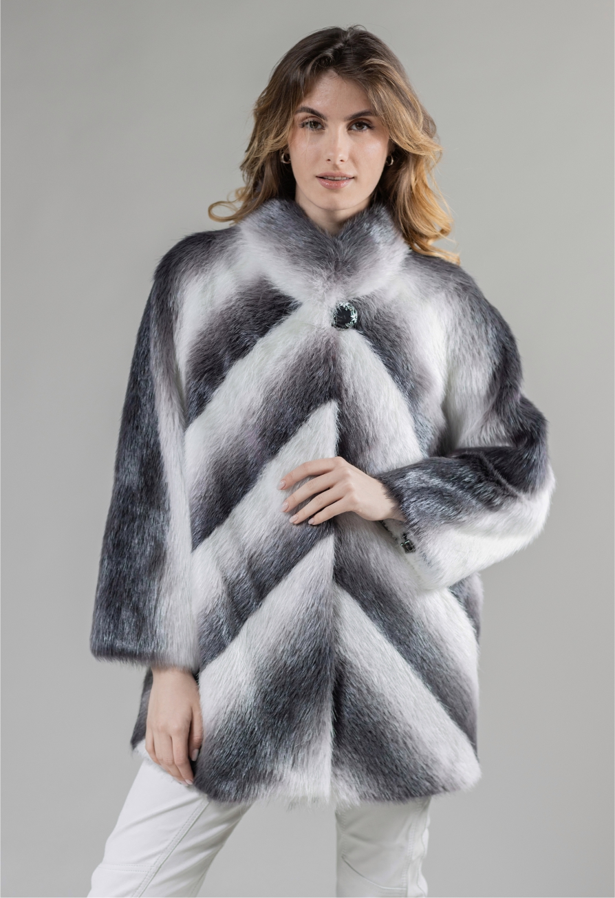 Яркая куртка из меха нутрии с эффектом «деграде». Самая светлая модель коллекции нутриевых шуб «Тверской меховой». Современные технологии крашения позволили добиться идеально белого цвета меха нутрии, градиентом переходящего в пепельно-серый. Потрясающий эффект! Диагонально-поперечное расположение шкур создает эффект «елочки», вытягивает и стройнит фигуру в любом размере: от 46 до 60. Светлый цвет и длинная ость меха нутрии освежают черты лица, делают его выразительнее и моложе. Длина изделия 80 см оптимальна для автоледи и городских женщин, долгое время проводящих в транспорте. За счет водоотталкивающих свойств меха нутрии шубе «Галина» не страшны мокрый снег и даже зимний дождь. Аккуратный шалевый воротник открывает свободу комбинирования головных уборов, платков, аксессуаров и украшений. Шуба «Галина» гармонично дополнит повседневный и праздничный образ, а также наряд практичной невесты. Сияйте и впечатляйте без лишних затрат и оглядки на погоду!Характеристики