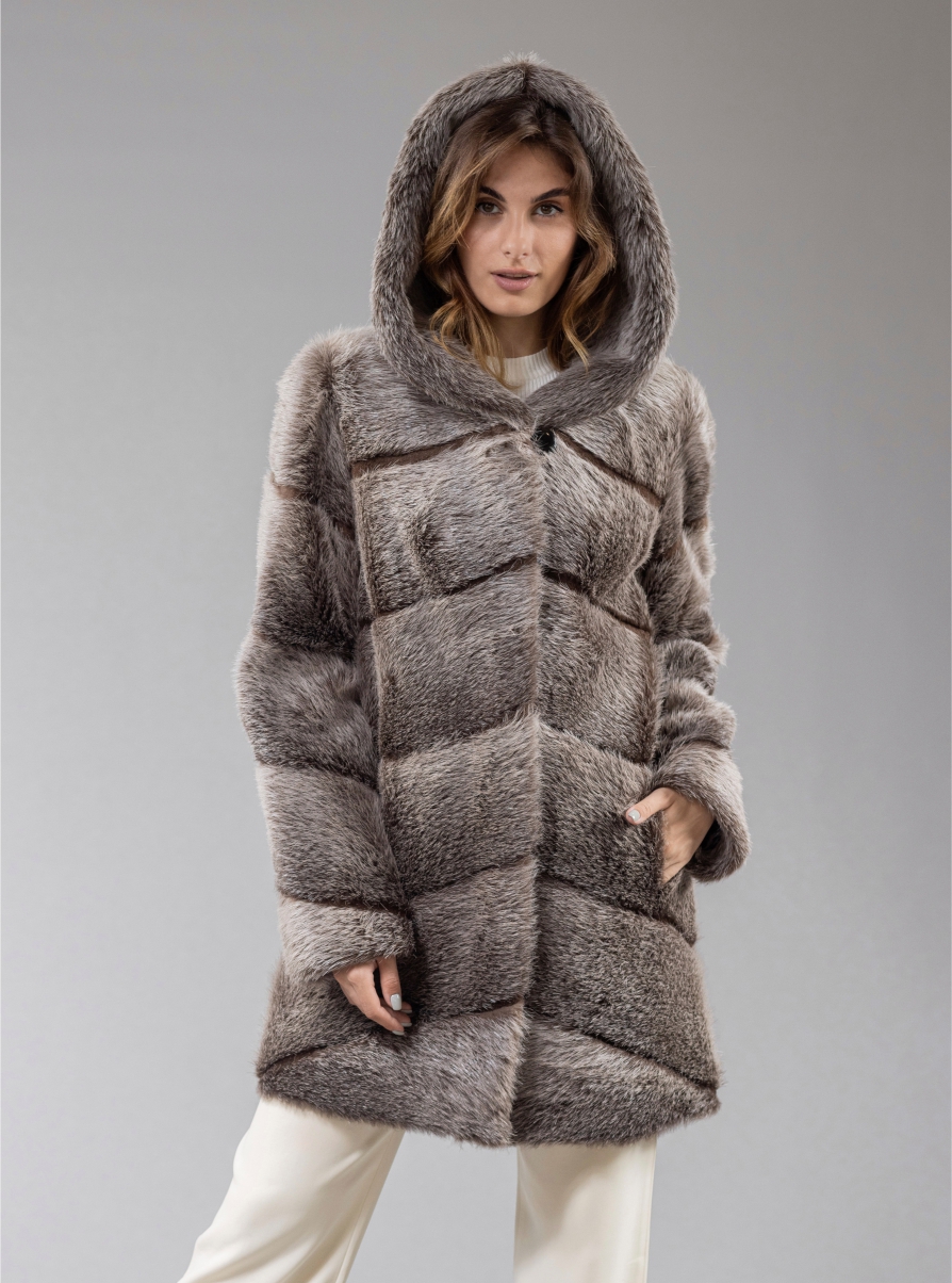 Шуба из нутрии «София» капюшон фундук цвета фундук