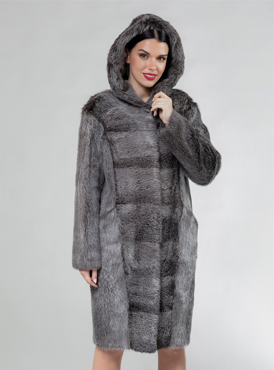Полупальто комбинированного кроя из меха нутрии с капюшоном. Шуба «Влада» создана в сочетании модного поперечного кроя на передней части изделия и кроя цельными пластинами на остальных элементах изделия. Вертикальная полоса «поперечки», сужающаяся книзу, визуально вытягивает и стройнит силуэт в любом размере: от 42 до 56. Шуба отлично защищает от ветра, холода, снега и даже дождя за счет водоотталкивающих свойств меха нутрии. Капюшон позволяет не утруждать себя выбором головного убора, при этом быть всегда в тепле. Силуэт «бутон», зауженный книзу, не стесняет движений и комфортен как в ходьбе, так и при управлении автомобилем. Теплый цвет капучино добавляет образу уюта. Будьте выше любых перипетий зимней погоды в шубе «Влада»!Характеристики
