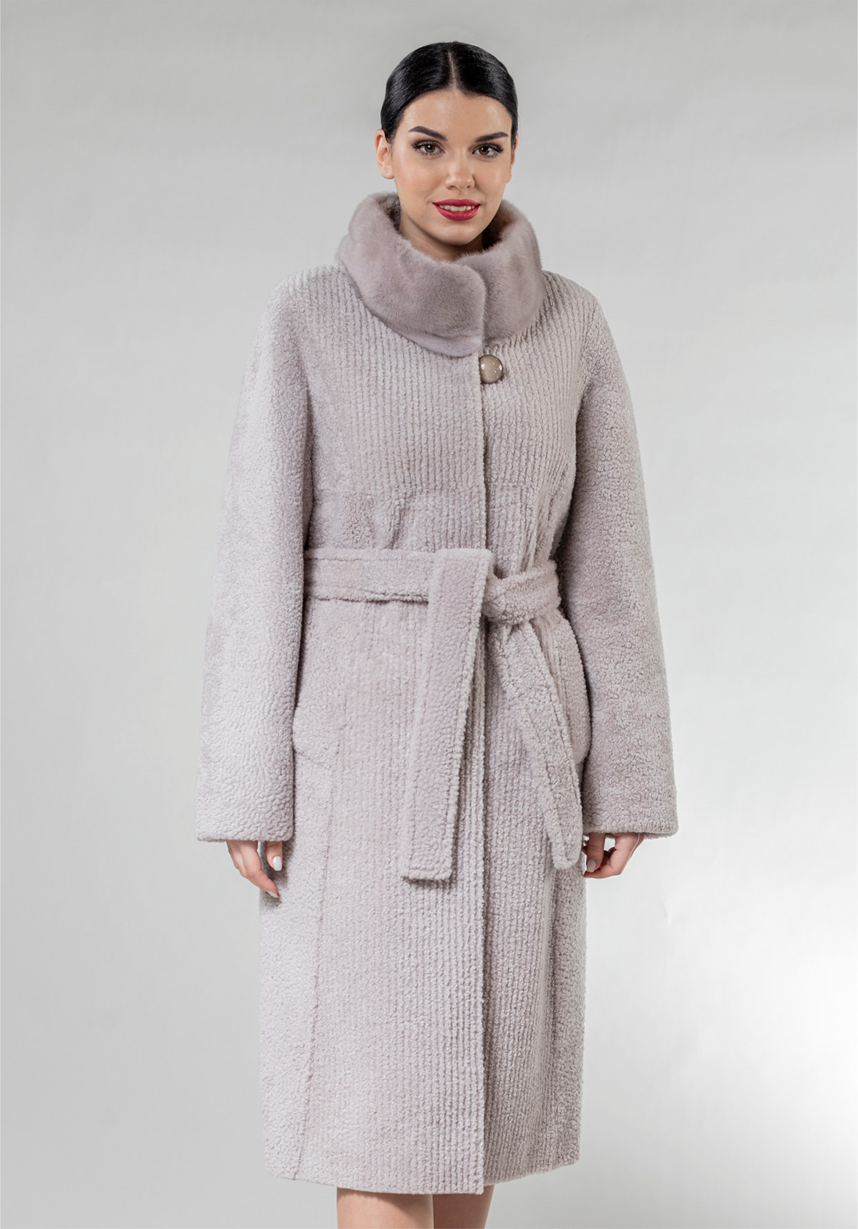 Длинное пальто с капюшоном из овчины с эффектом керли, классическая модель в современном звучании. Строгий прямой силуэт пальто, плоский завиток керли, крой цельными пластинами, воротник-стойка, отделанный мехом благородной норки — все это элементы классики зимнего гардероба. Пикантные нотки придает изделию выраженный ребристый рисунок, полученный путем особой обработки овчины. Фактурные ребристые вставки отчетливо выделяются на передней части пальто. Плоский завиток керли на остальной части изделия приятен глазу и на ощупь. Пудровый цвет «аметист» делает образ свежим и женственным. Гармоничным дополнением к шубе «Аллегра» могут стать яркий платок на голову и перчатки.Характеристики