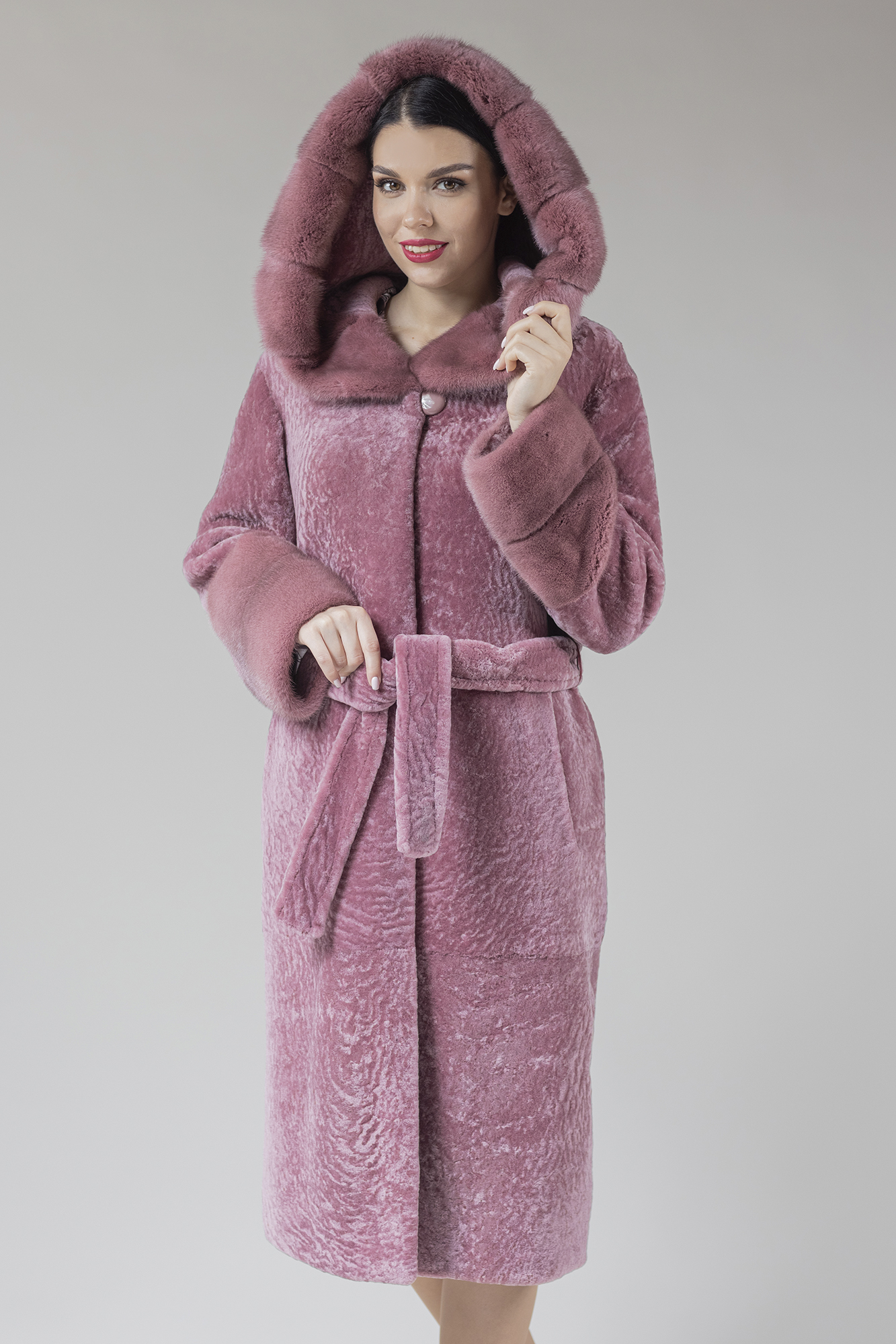 Оригинальное длинное пальто из овчины премиум. В крое изделия используются узнаваемые элементы халата: объемный капюшон, манжеты-отвороты, широкий пояс. В шубе «Диана» так же уютно! Неповторимый муаровый рисунок овчины премиум приятен глазу и на ощупь. Элегантность образу придает отделка капюшона и манжетов мехом благородной норки. В ненастную погоду вы можете надеть капюшон, защитившись от ветра и осадков, в погожий день разложить капюшон по линии плеч, создав эффект норкового палантина. Насыщенный розовый цвет привлекателен без дополнительных украшений. Создать праздничный образ помогут аксессуары — яркий платок и перчатки.Характеристики