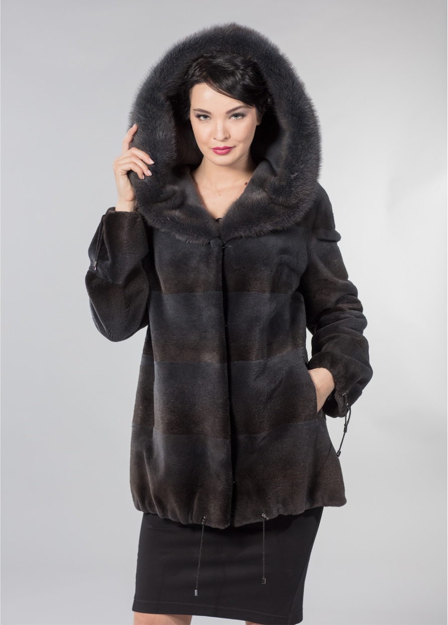 Куртка из стриженой нутрии прямого силуэта. Сшита из цельных шкур. Меховые пластины выложены поперечно. Мех блестит и переливается разными оттенками. С помощью кулиски на подоле можно менять силуэт изделия, а кулиска на рукавах создает визуальный эффект «фонарика». Удобная длина отлично подходит для ежедневного городского ритма. Капюшон отделан мехом норки, он прекрасно защитит от непогоды. Раскинутый по плечам капюшон придаёт изделию невероятную женственность и смотрится, как воротник. Используется надёжная импортная фурнитура. Куртка из стриженой нутрии «Кира» – комфорт и свобода движений.Характеристики