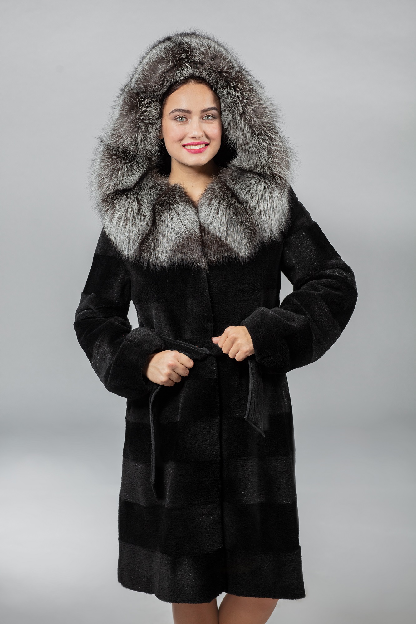 Шуба из стриженной нутрии модного поперечного кроя. Приталенный силуэт прекрасно дополняют рукава-фонарики, придавая образу романтики и женственности. Большой и удобный капюшон отделан мехом чернобурой лисицы. Игристый, длинный, блестящий мех лисы мгновенно очаровывает и привлекает внимание. Опущенный капюшон ложится на плечи и создаёт эффектный образ. Используется надёжная импортная фурнитура. Технология стрижки существенно облагораживает мех нутрии. Мех смотрится как стриженая норка, но более доступен по цене. Шуба из меха стриженной нутрии «Лотос» – сочетание дерзости и элегантности.Характеристики