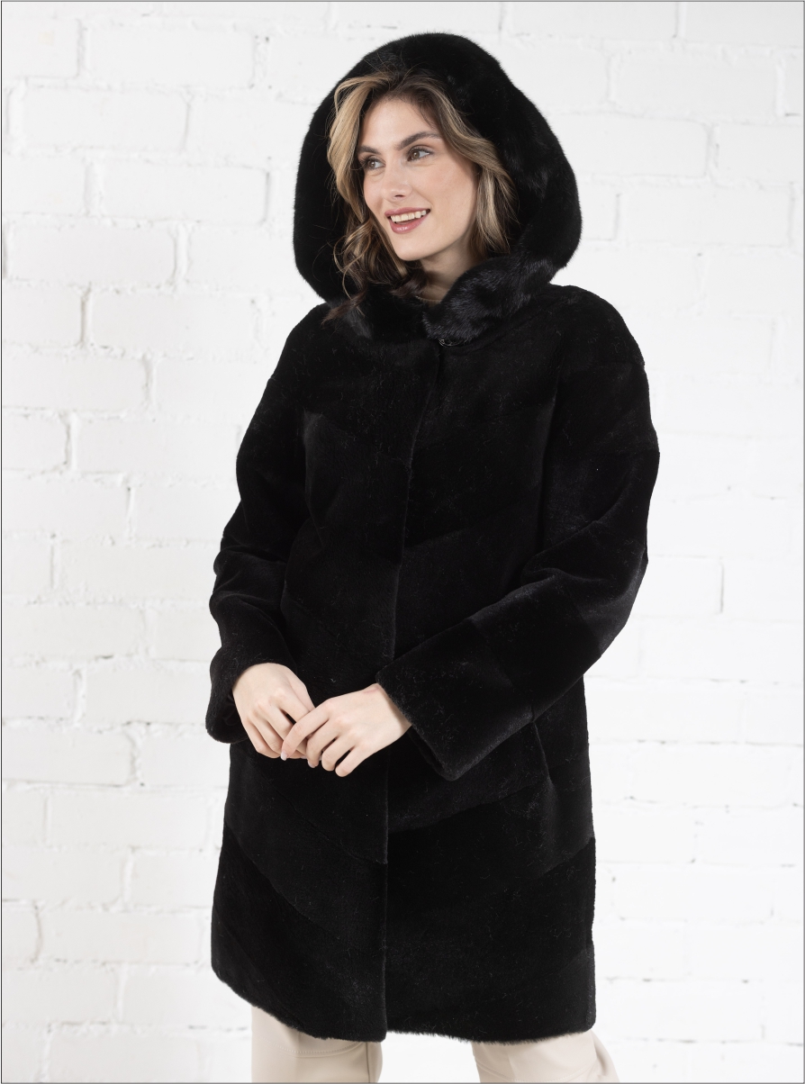 Шуба из стриженой нутрии «Сильвия» капюшон черный цвета черный