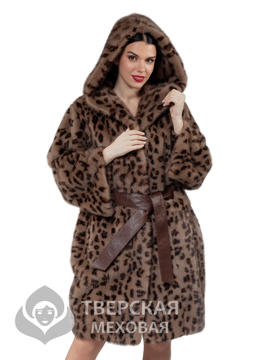 Дизайнерское полупальто из отборного меха норки с модным анималистичным принтом «под леопард», капюшоном «кобра» и кожаным поясом, вставленным через разрезы. Крой изделия напоминает свободный «бутон», силуэт заужен книзу. Расклешенный рукав добавит свободы и красоты движениям. Такой вид рукавов можно красиво дополнить длинными перчатками или митенками.Характеристики