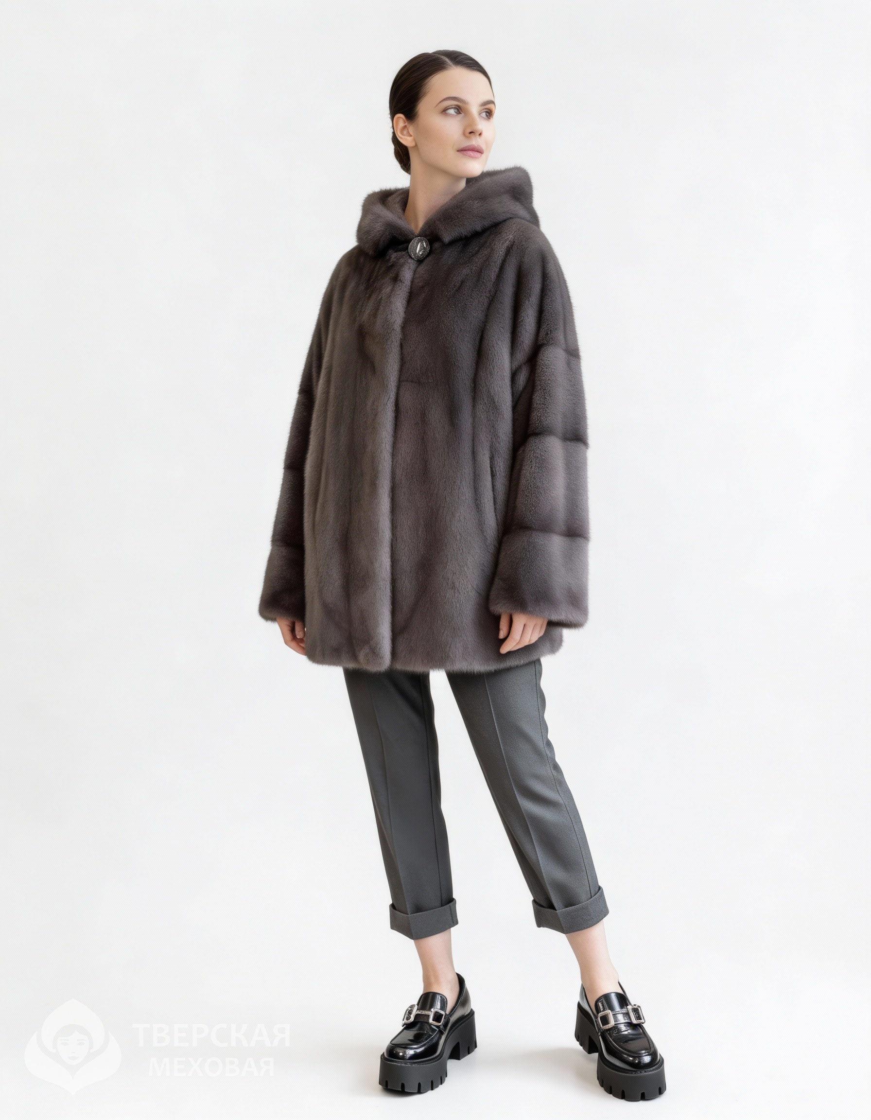 Норковая шуба «Снежанна» капюшон серый цвета серый