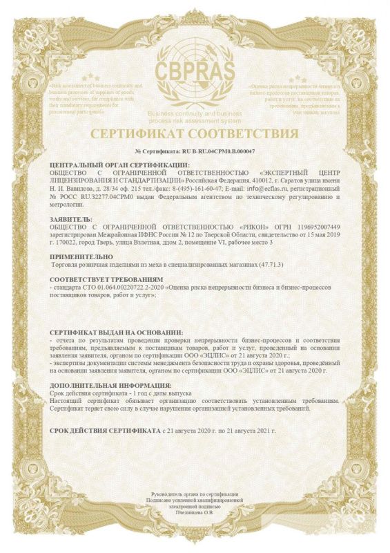 Специалисты ОТК тщательно проверяют, чтобы каждое изделие соответствовало требованиям Технического регламента Таможенного союза «О безопасности продукции легкой промышленности», а так же требованиям российских и советских ГОСТов, а именно: ГОСТ 8765-93 «Одежда меховая и комбинированная. Общие технические условия»; ГОСТ 19878-74 «Меха, меховые и овчинно-шубные изделия. Маркировка, упаковка, транспортирование, хранение»; ГОСТ 4103-82 «Изделия швейные. Методы контроля качества»; ГОСТ Р 52584-2006 «Одежда меховая. Общие технические условия»; ГОСТ Р 52586-2006 «Одежда на меховой подкладке. Общие технические условия»; ГОСТ Р 52585-2006 «Одежда из меховых шкурок с отделкой кожевой ткани и шубной овчины. Общие технические условия»; ГОСТ 5710-85 «Одежда из овчины шубной и мехового велюра. Общие технические условия»; ГОСТ 16958-71 (СТ СЭВ 1729-79) «Изделия текстильные. Символы по уходу»; САНПиН 1286 «Гигиенические требования к материалам для изготовления одежды, контактирующим с кожей человека»; «Товароведение и экспертиза пушно-меховых изделий».